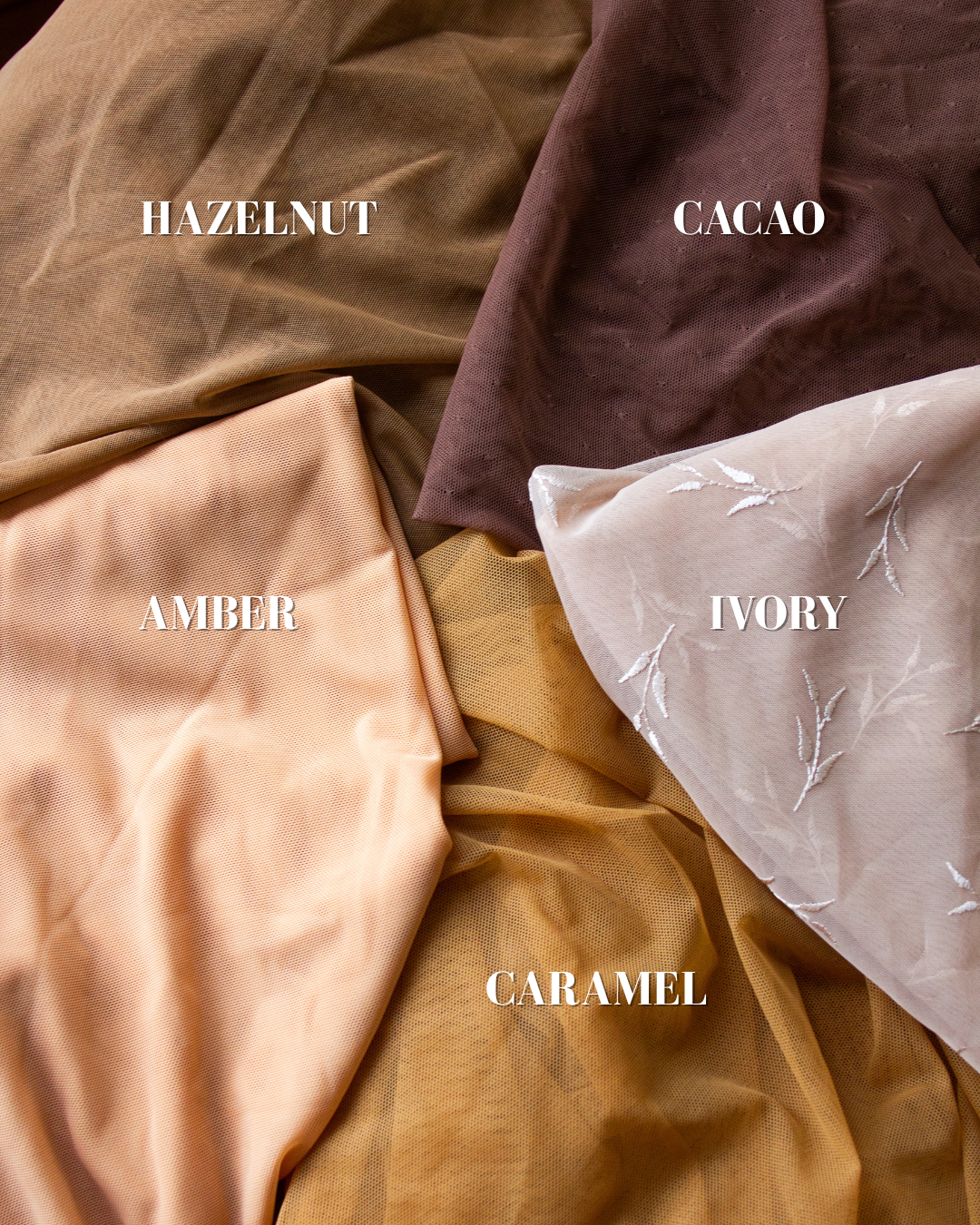 The Maggie bralette, an essential basic. The underbust band and shoulder straps are fully adjustable to your liking. The bralette is available in five different skin-tone mesh colors. If you have any questions about a specific color, please contact us.